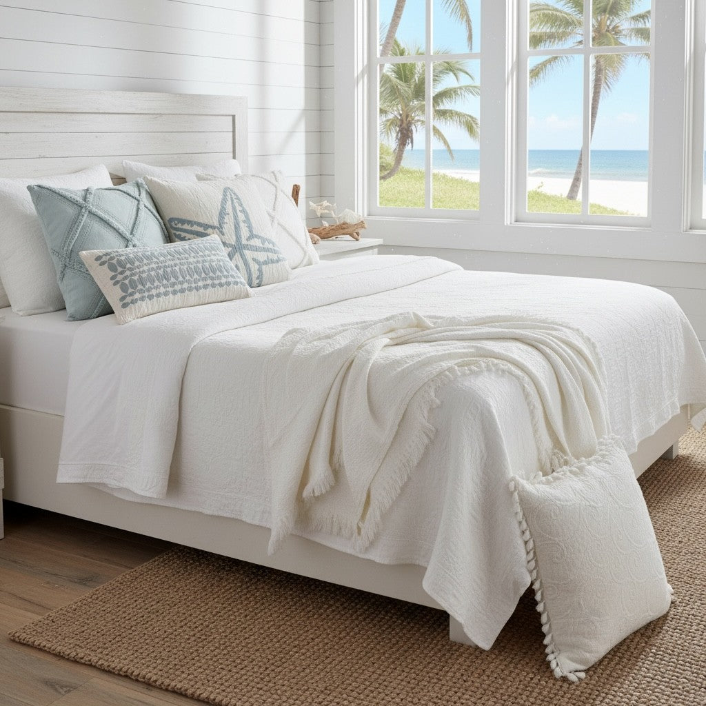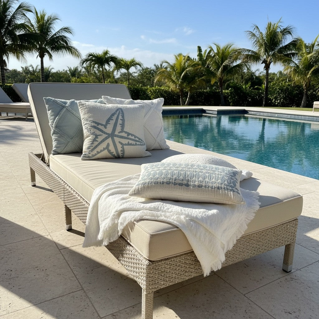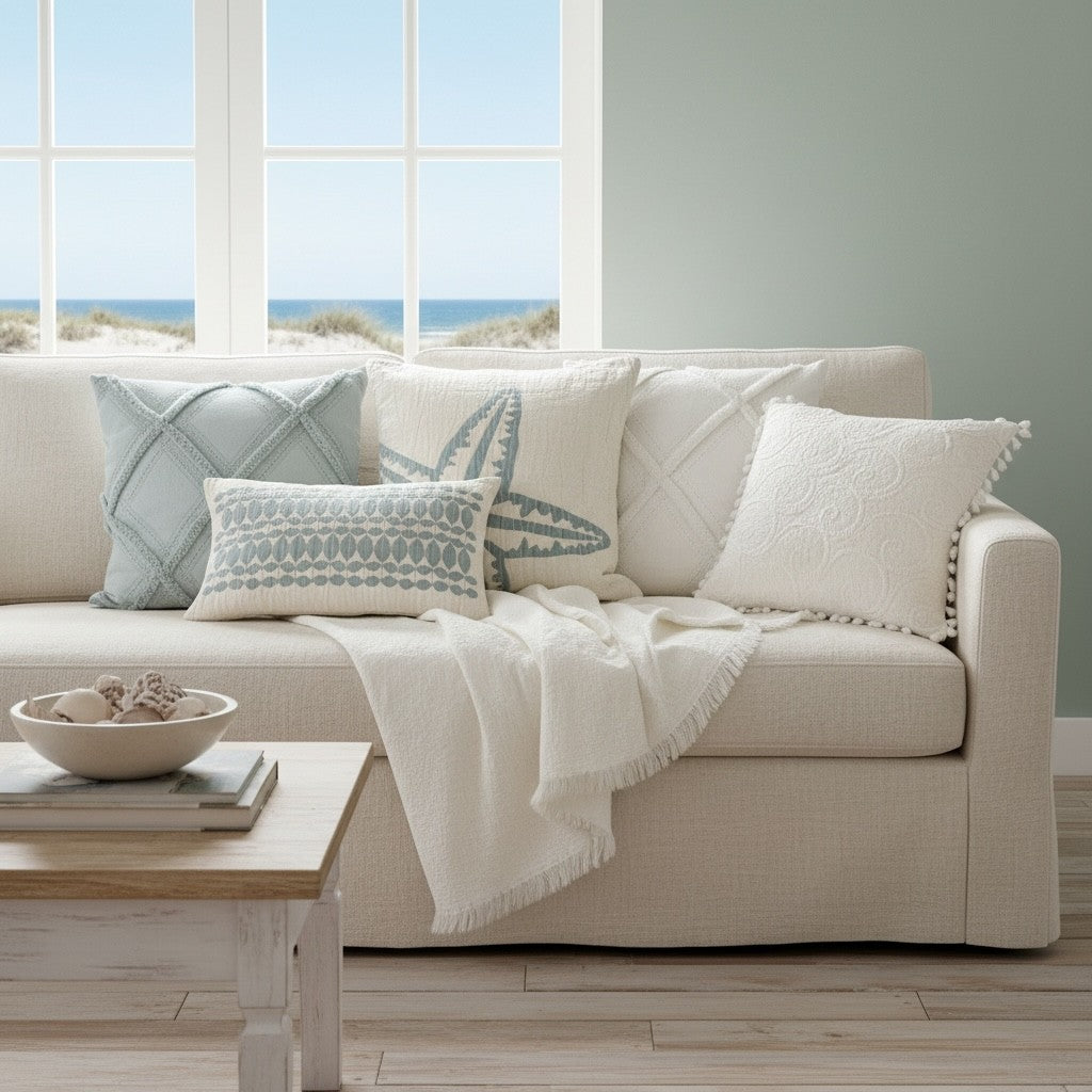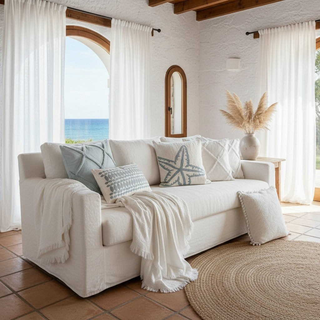 Verleihen Sie Ihrem Zuhause einen coolen Touch mit der Kissenhülle Offwhite-Aqua-Blue Seestern. Diese hochwertige texturierte Kissenhülle aus 100% Baumwolle ist sowohl stilvoll als auch praktisch und setzt dekorative Akzente in jedem Raum. Mit ihrer Grösse von 50 x 50 cm ist sie perfekt geeignet für Sofas, Sessel oder Betten. Die Kissenhülle lässt sich wunderbar mit anderen Kissen aus unserer Kollektion kombinieren oder auch als Einzelstück, um einen harmonischen Look zu erzeugen. Insbesondere passend sind die Offwhite Aqua-Blue floral und die Boho Fransen Aqua-Blue Kissenhülle.